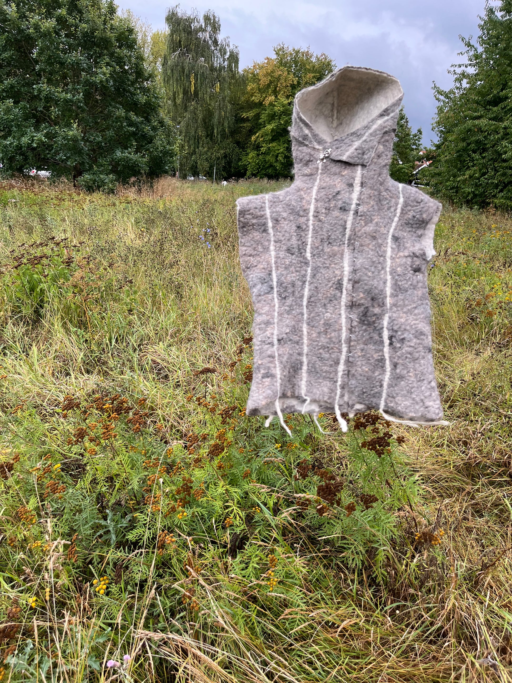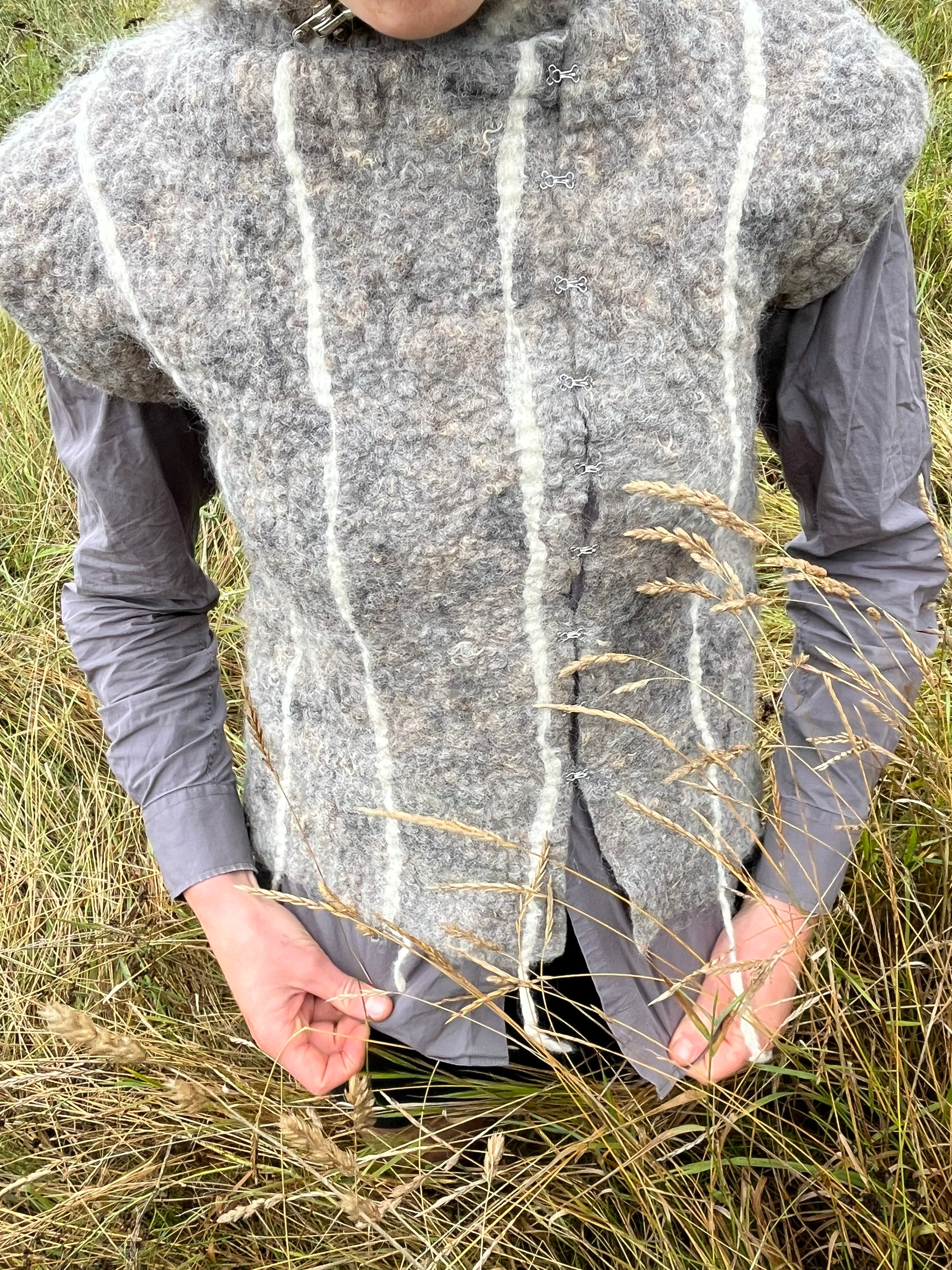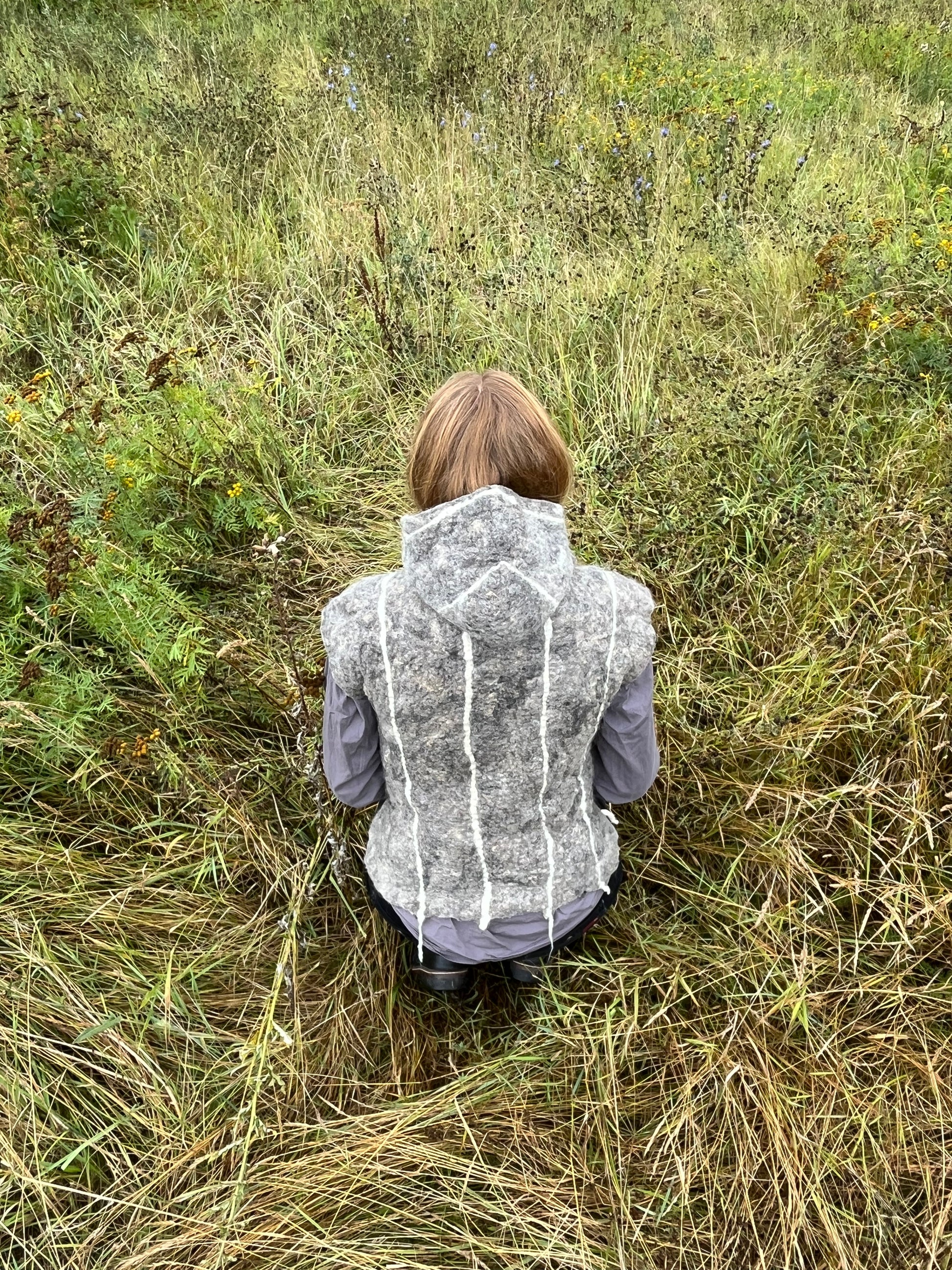 Filtet vest med påsyet hætte i grå fåreuld fra Sjælland, med hvide striber af karteflor fra Hjelholts Uldspinderi.