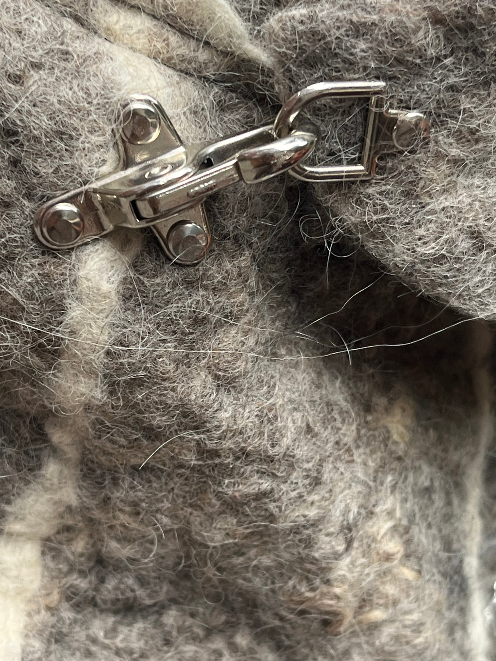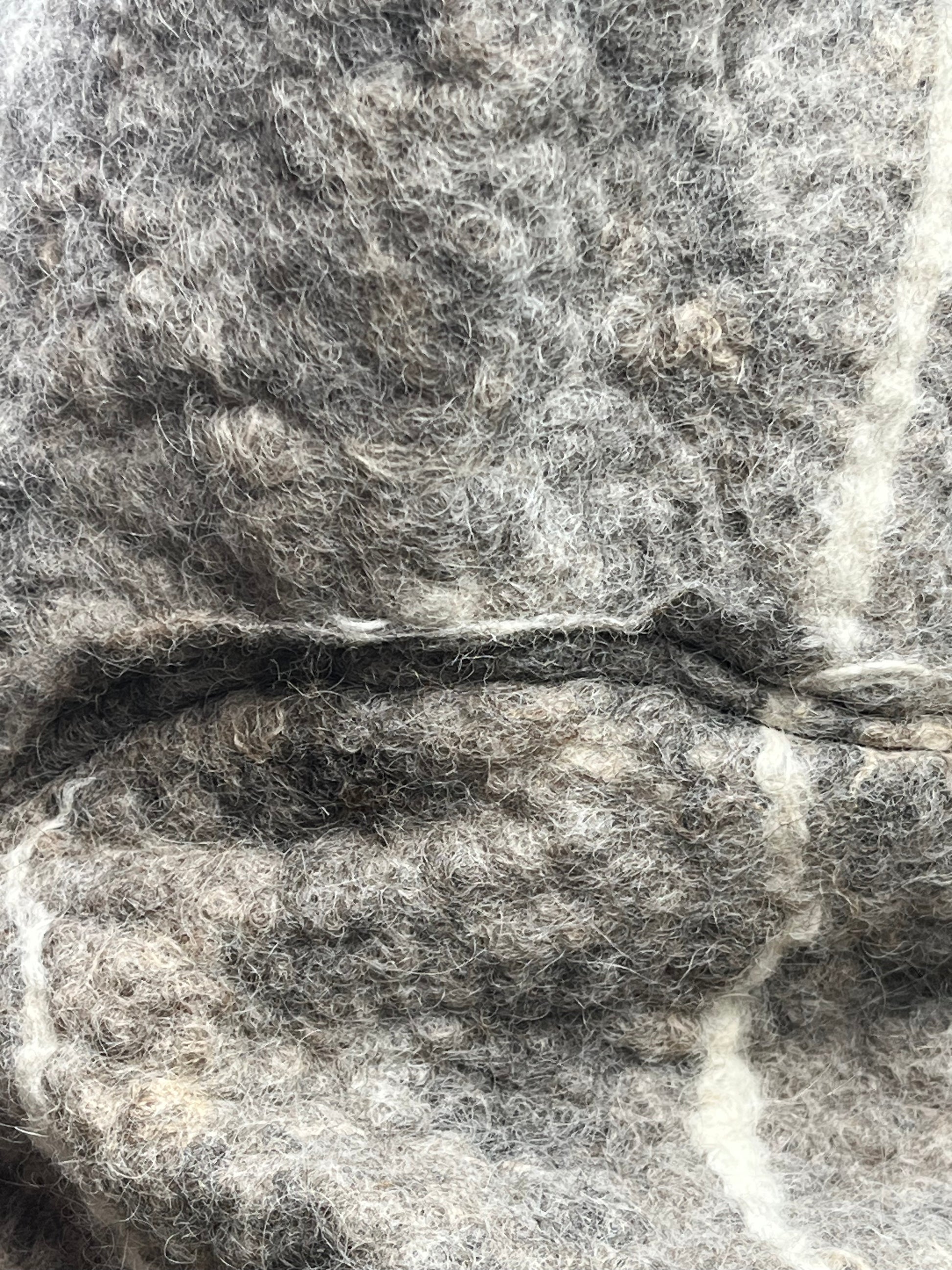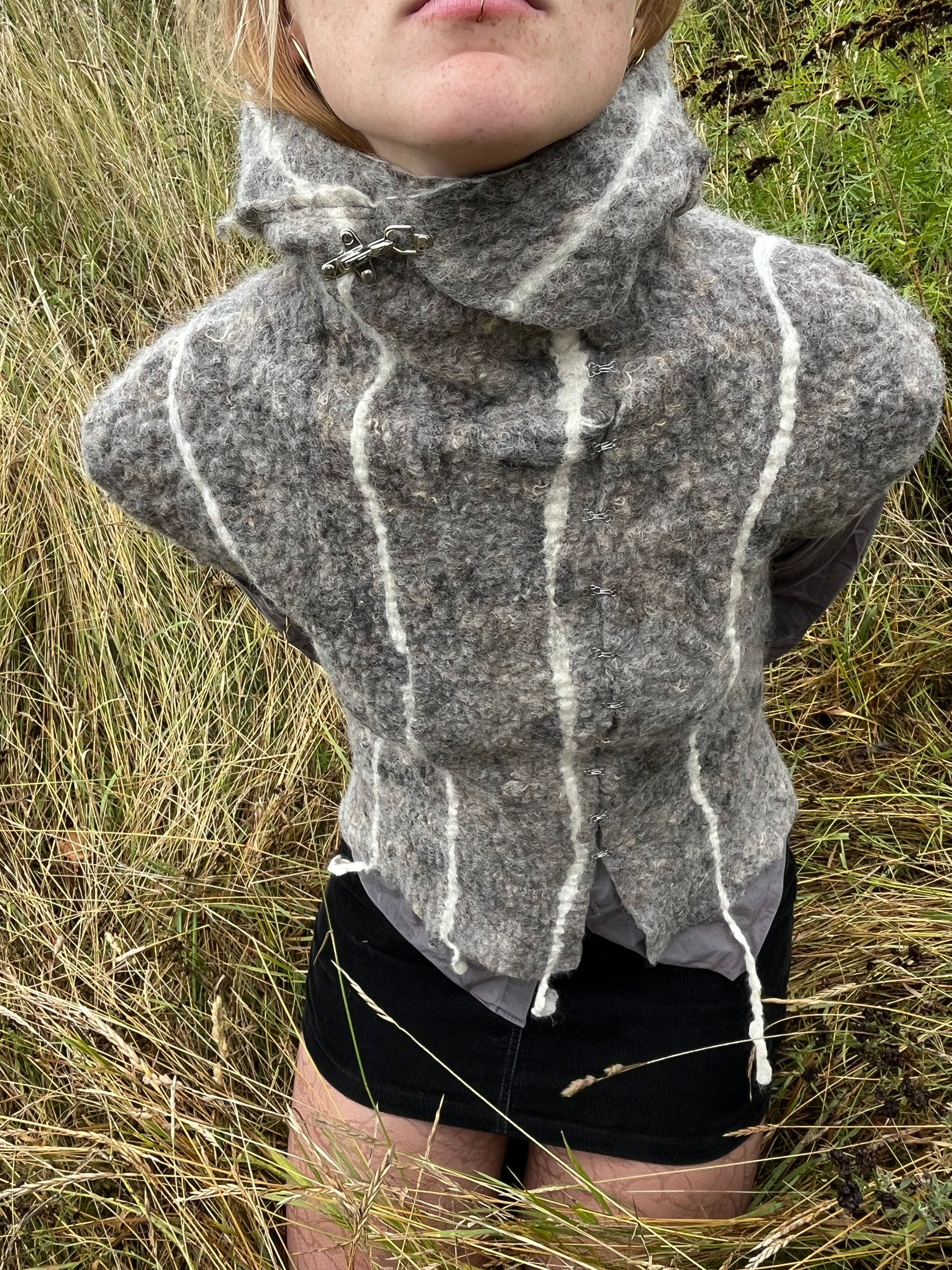 Filtet vest med påsyet hætte i grå fåreuld fra Sjælland, med hvide striber af karteflor fra Hjelholts Uldspinderi.