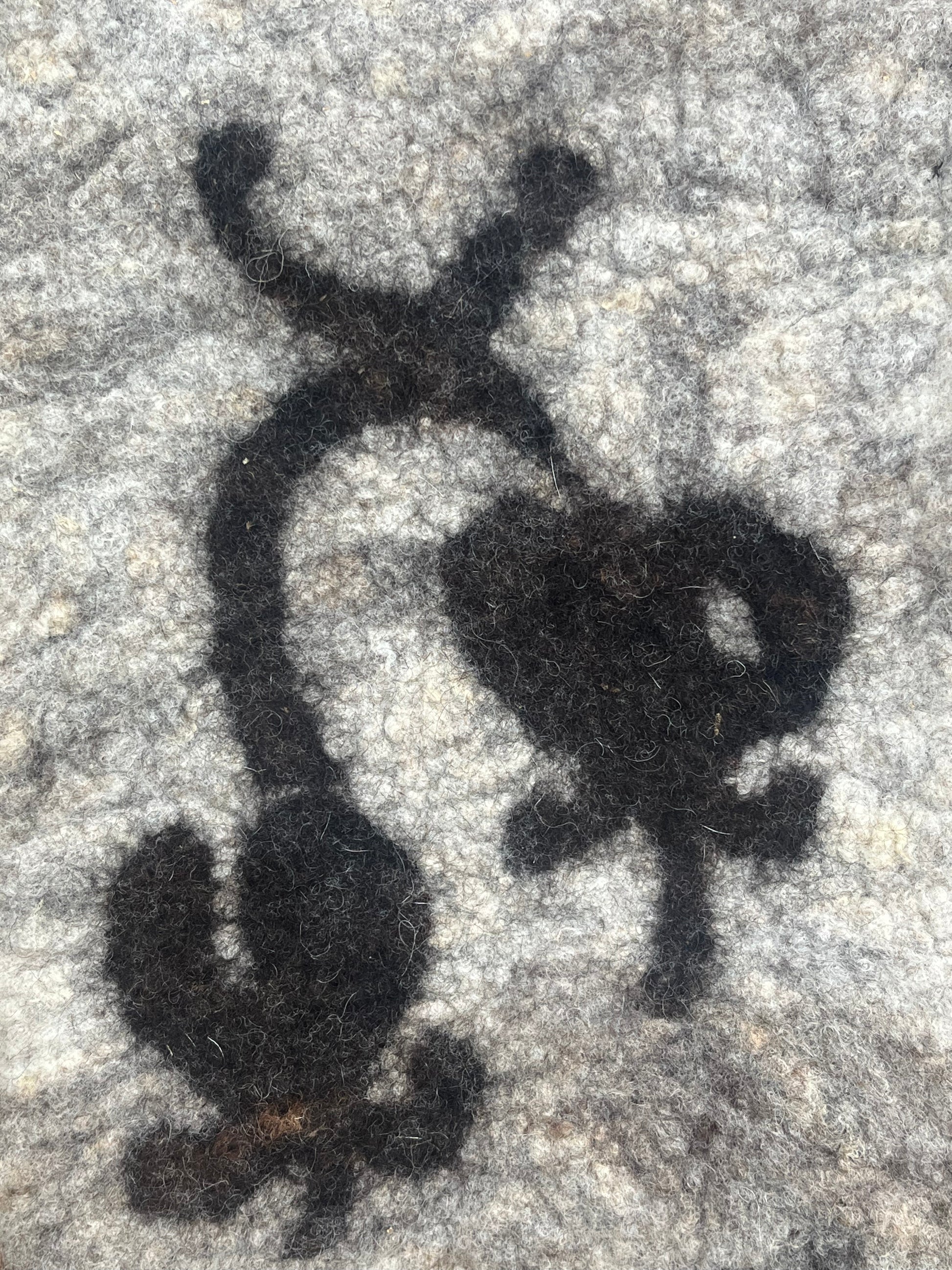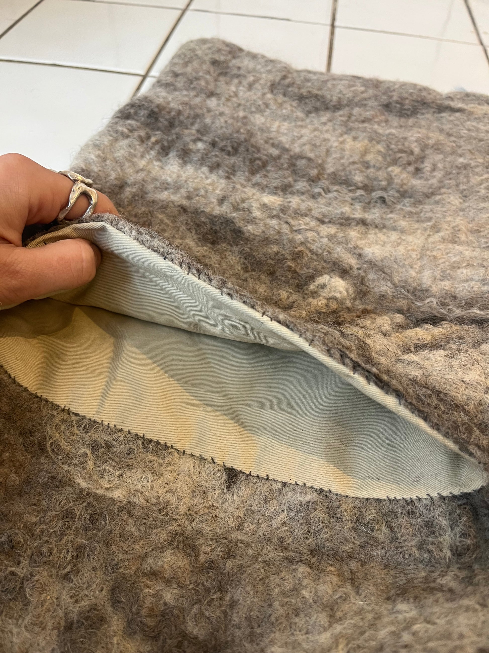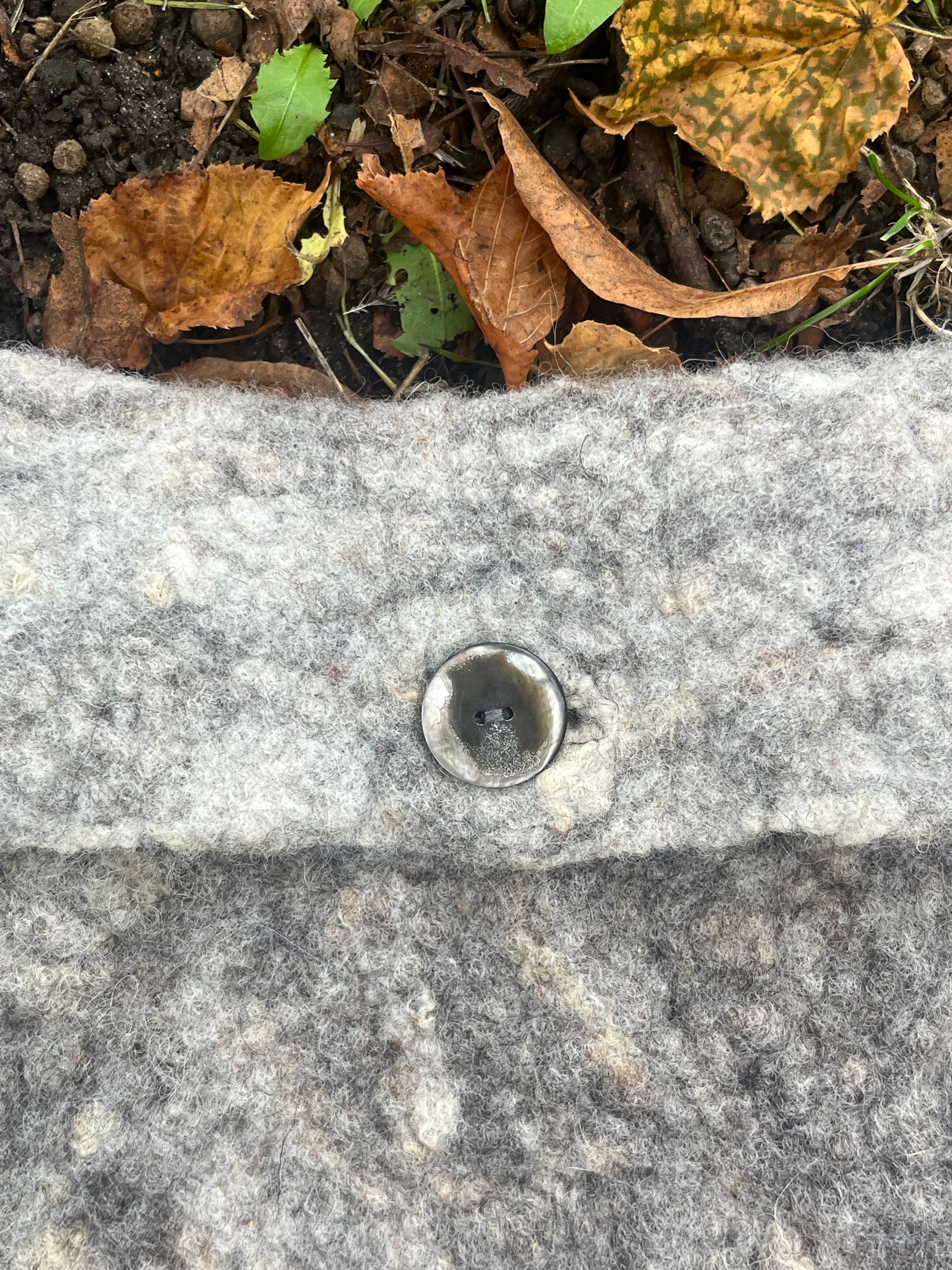 Vådfiltet computer cover i grå og sort uld. Coveret er foret med bomuldsstof.