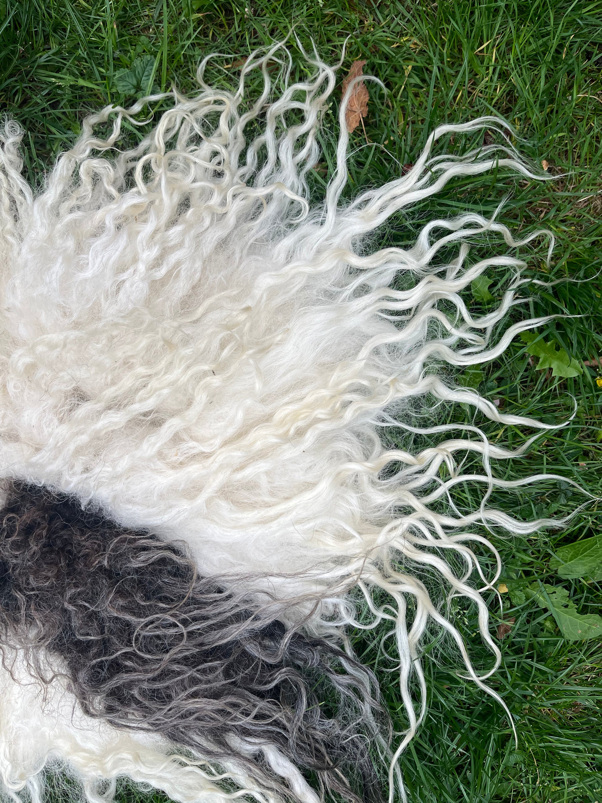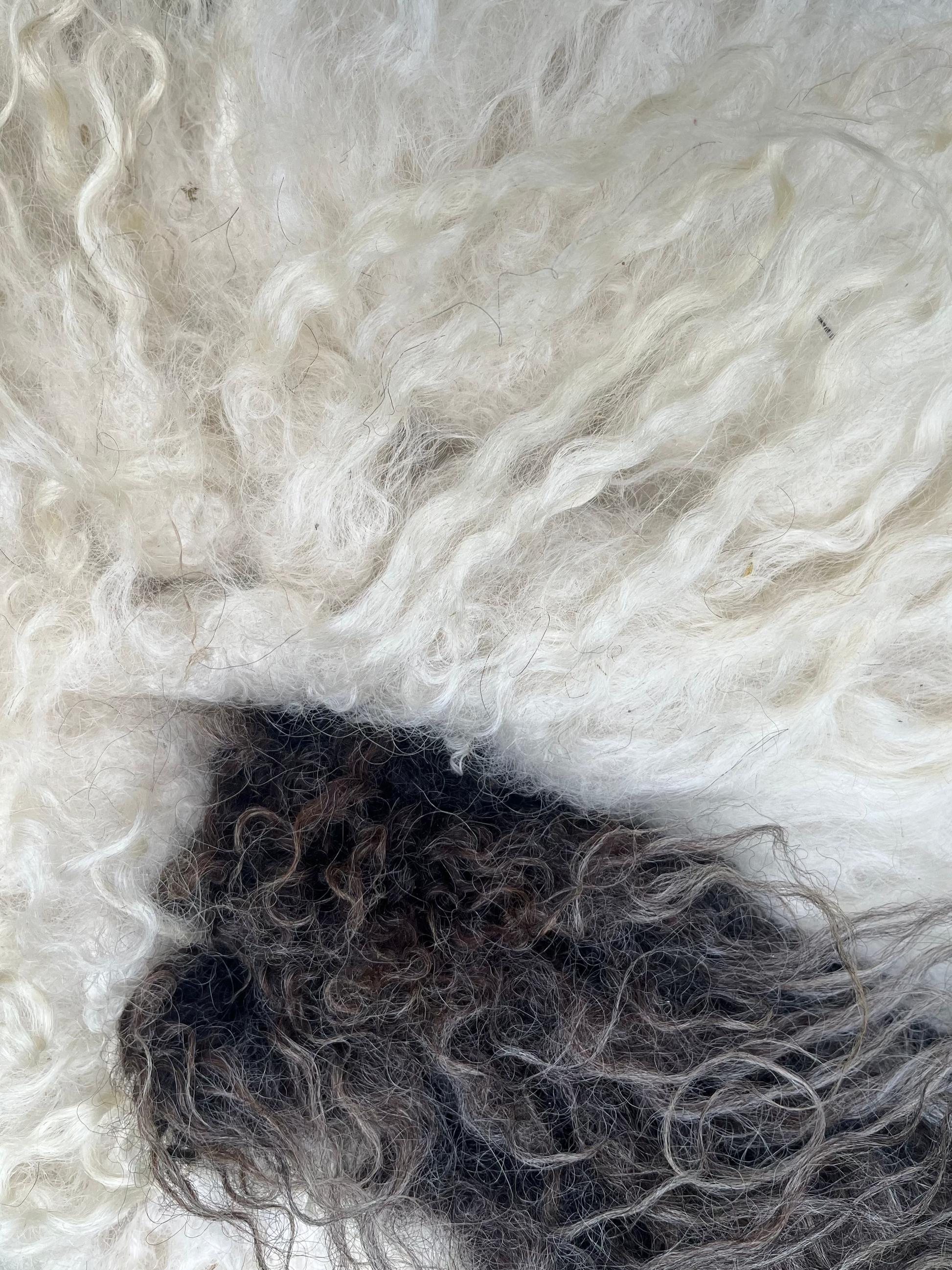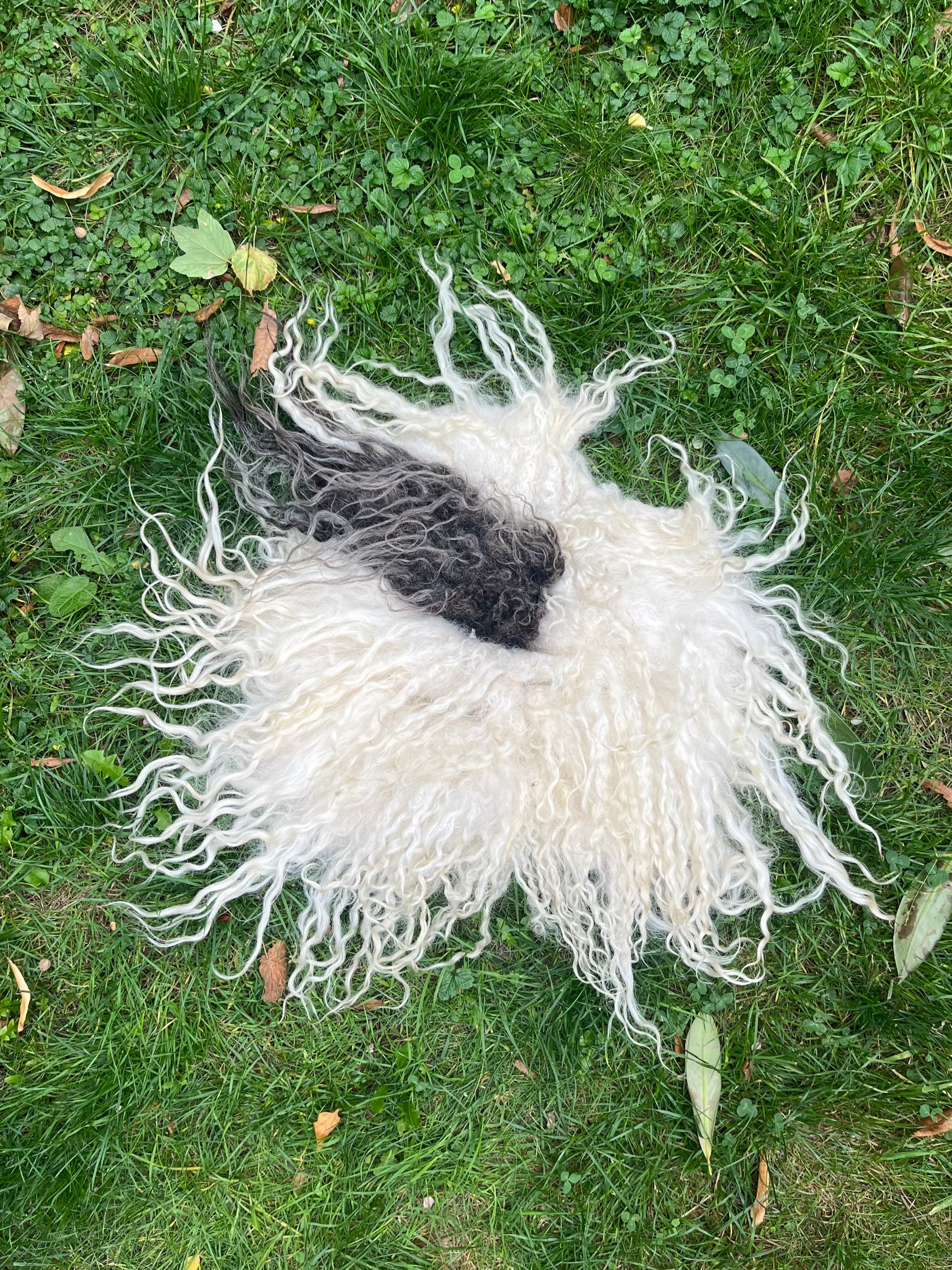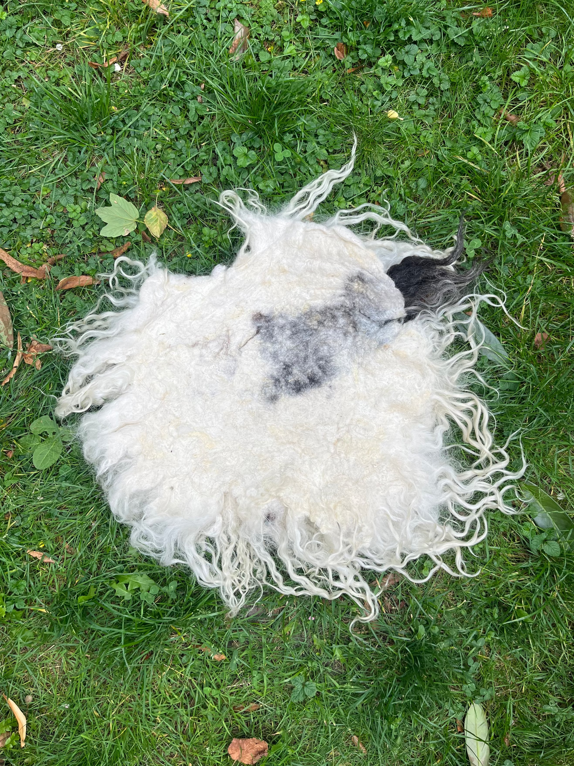 Vådfiltet siddepude i hvid og gråbrun spælsau uld fra Lystbækgård. Siddepuden er idéel til udendørs brug og er let at rengøre. De filtede siddepuder er et fantastisk alternativ til skind.