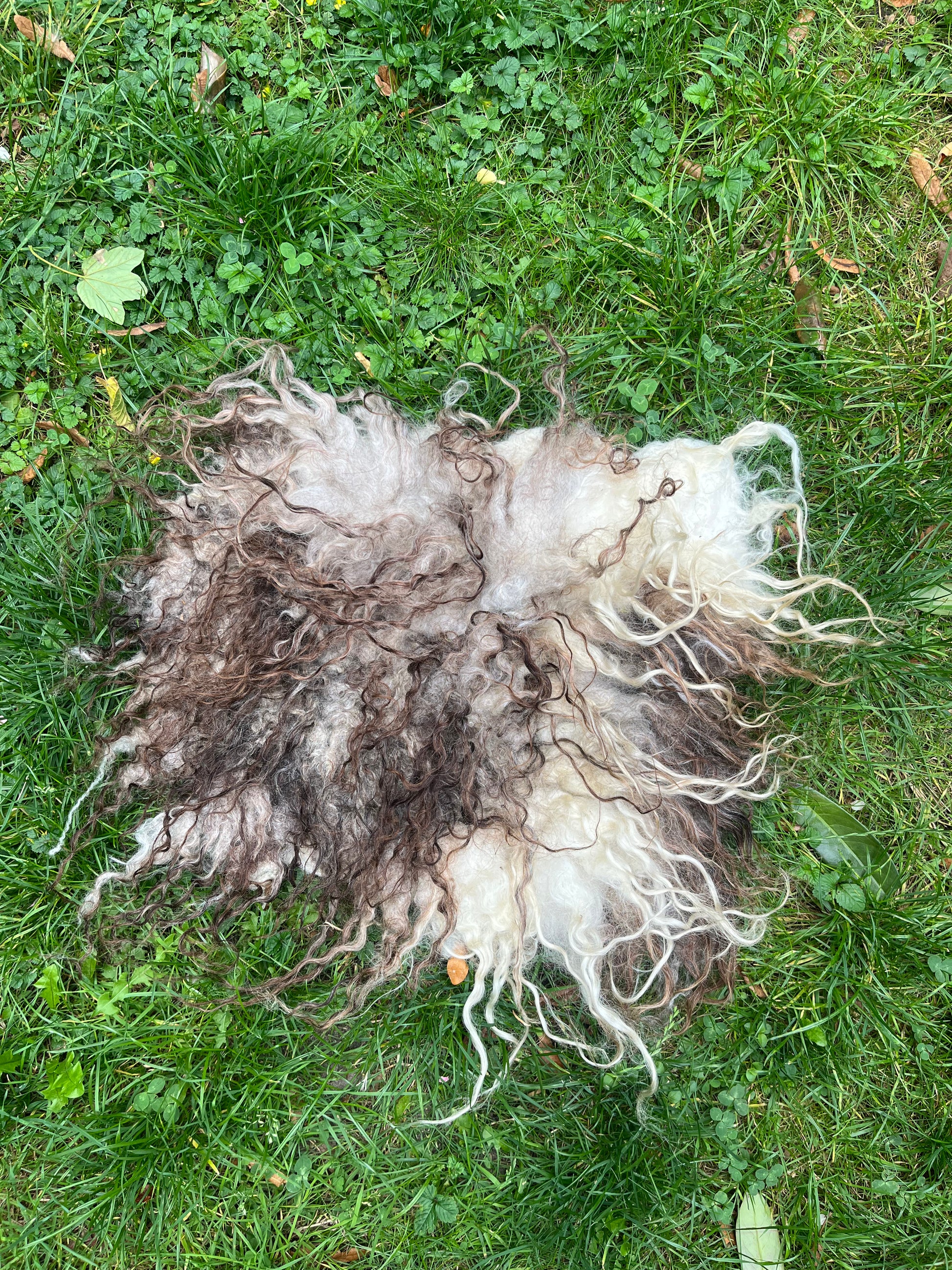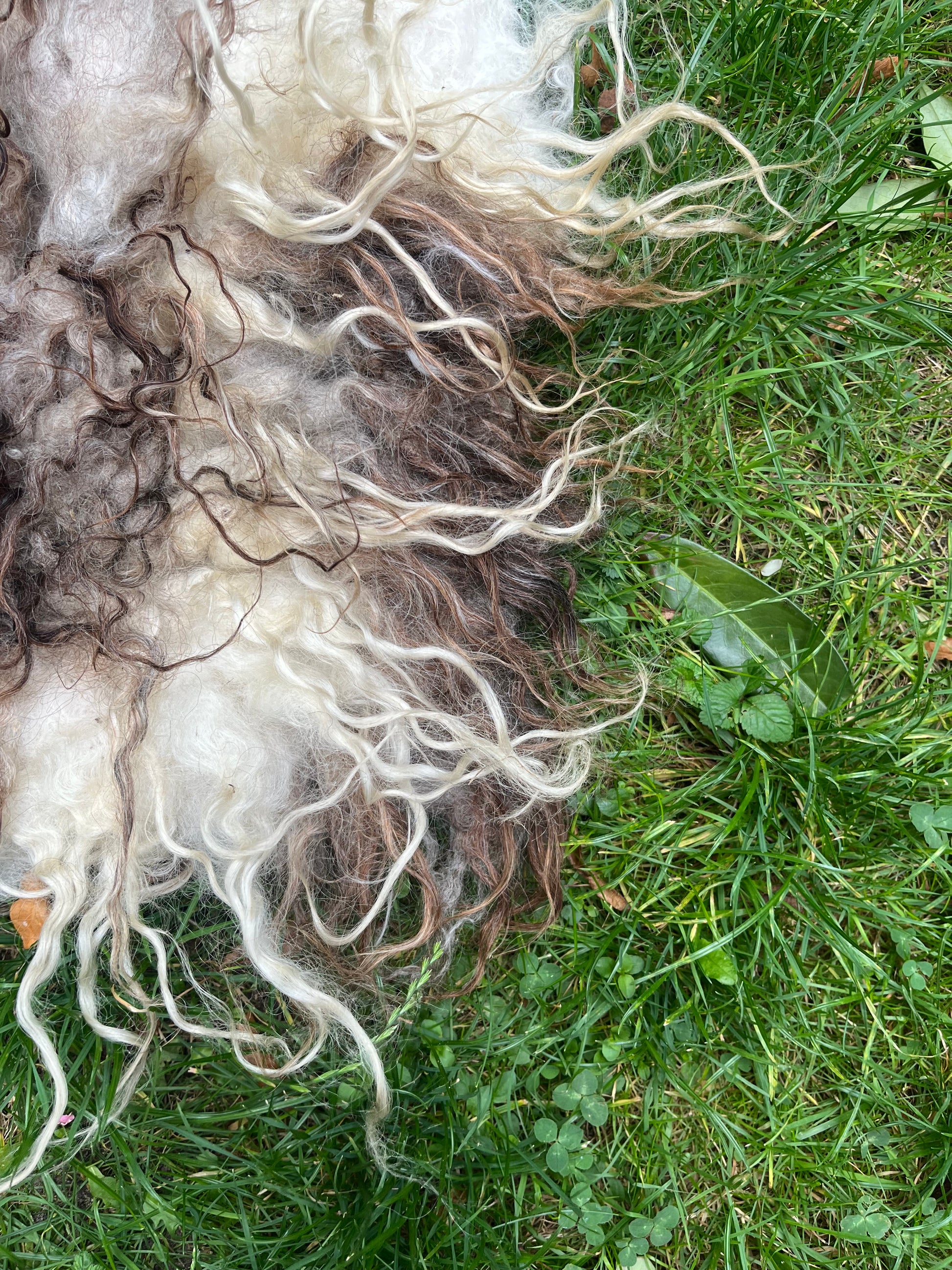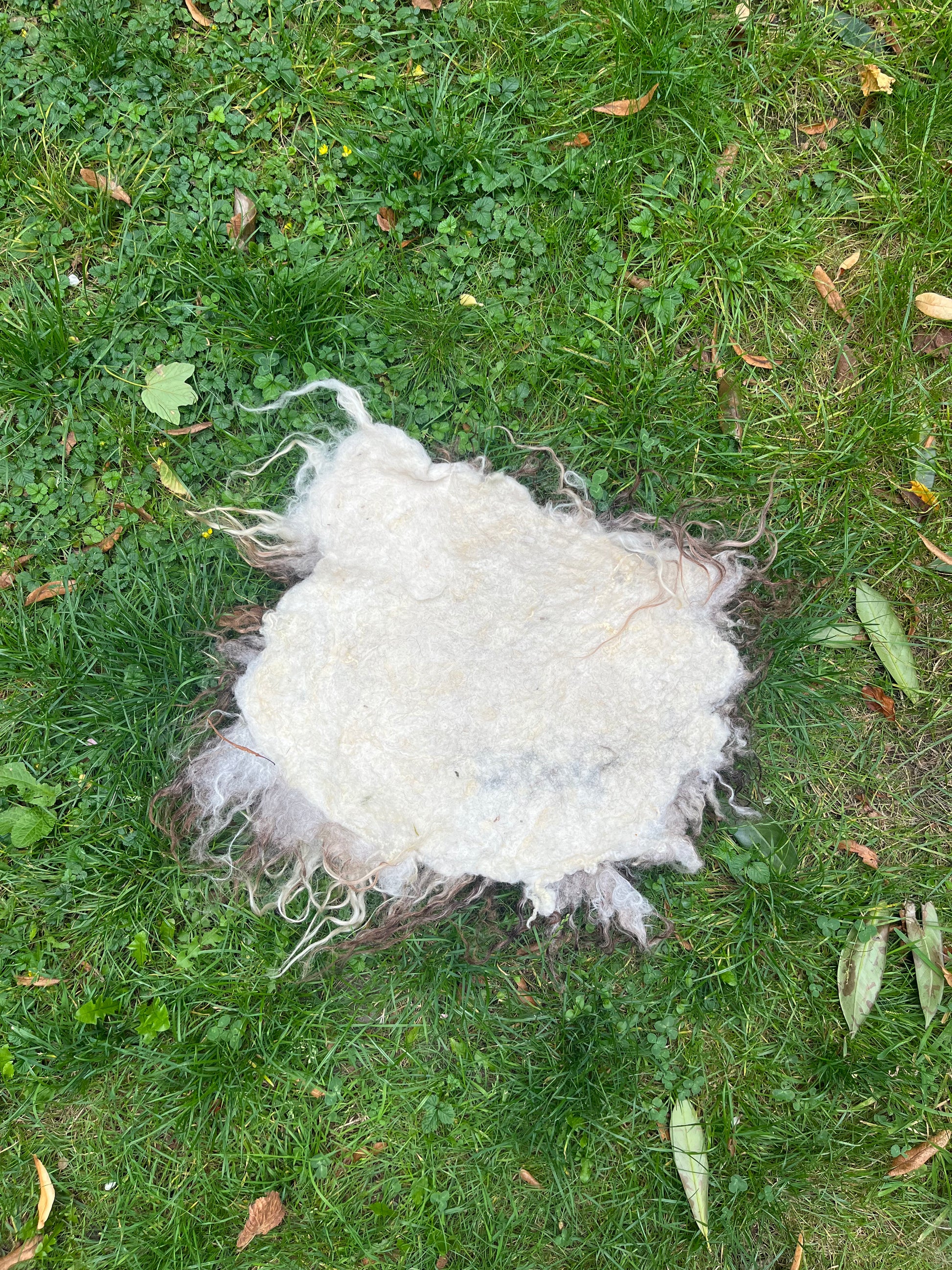 Vådfiltet siddepude i brun og hvid spælsau uld fra Lystbækgård. Siddepuden er idéel til udendørs brug og er let at rengøre. De filtede siddepuder er et fantastisk alternativ til skind.